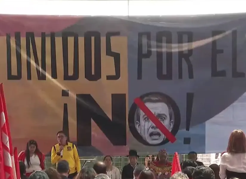 Un total de 36 movimientos y organizaciones sociales conformaron una alianza, este sábado 25 de octubre de 2025, para promover el NO en la Consulta Popular, el próximo 16 de noviembre. El coliseo de la Unión Nacional de Educadores (UNE), en el norte de Quito, lució lleno, con cerca de 600 personas en la reunión que llamaron Unidos por el NO Hubo banderas, gigantografías y carteles para rechazar la Asamblea Constituyente y las preguntas sobre la instalación de bases militares extranjeras, reducción de asambleístas y eliminación del financiamiento público a las organizaciones políticas. “Nada de las preguntas es para mejorar la seguridad o aumentar el empleo”, manifestó Edwin Bedoya, presidente del Frente Unitario de Trabajadores (FUT).