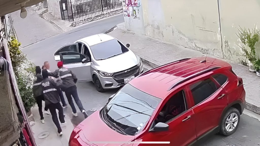 Un hombre que llegaba a su domicilio en su auto fue secuestrado por tres hombres vestidos de policías. En las imágenes se observa a cómo los armados con chompas de la Policía Judicial se bajan de un automóvil y se llevan a la fuerza al ciudadano.