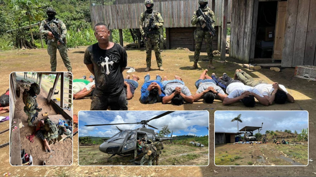 En una operación realizada en Esmeraldas, también se detuvo a otras diez personas presuntamente vinculadas a actividades ilícitas, como extorsiones, tráfico de armas, amedrentamiento y protección armada de minería ilegal en la zona. En sus redes sociales, el Ejército informó de que al ingresar en una vivienda de madera que funcionaría como base clandestina, el personal militar fue recibido con disparos.