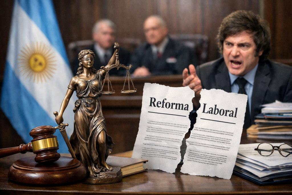 La Justicia argentina suspendió este lunes 82 de los 218 artículos de la Ley de Modernización Laboral, impulsada por Javier Milei y aprobada en febrero. El juez Raúl Ojeda acogió una cautelar de la CGT por «indicios de regresividad» y riesgo de daños irreparables. La medida afecta artículos que limitan la huelga, la negociación colectiva, los períodos de prueba y las indemnizaciones. También deja sin efecto cambios en teletrabajo, tercerización y plataformas digitales. El gobierno apelará y acusó a la CGT de priorizar «intereses corporativos». Es uno de los mayores frenos judiciales a la reforma, que suma otros fallos y fue promulgada tras masivas protestas.