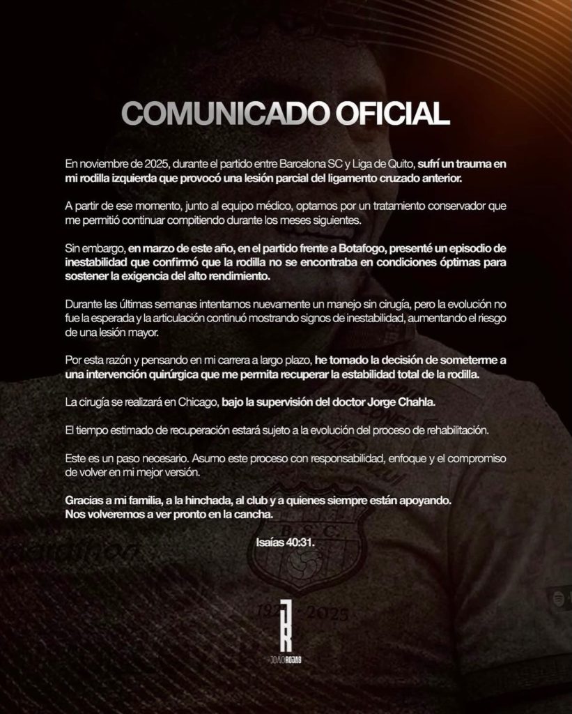 Joao Rojas, futbolista de Barcelona SC, se someterá a una cirugía en su rodilla izquierda en Chicago, Estados Unidos, tras no alcanzar una recuperación completa de la lesión que arrastra desde noviembre de 2025.